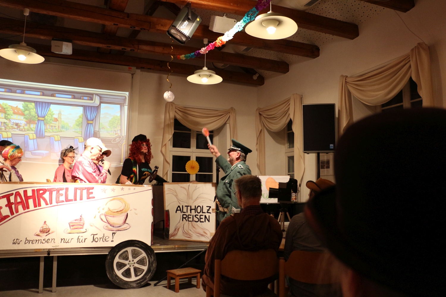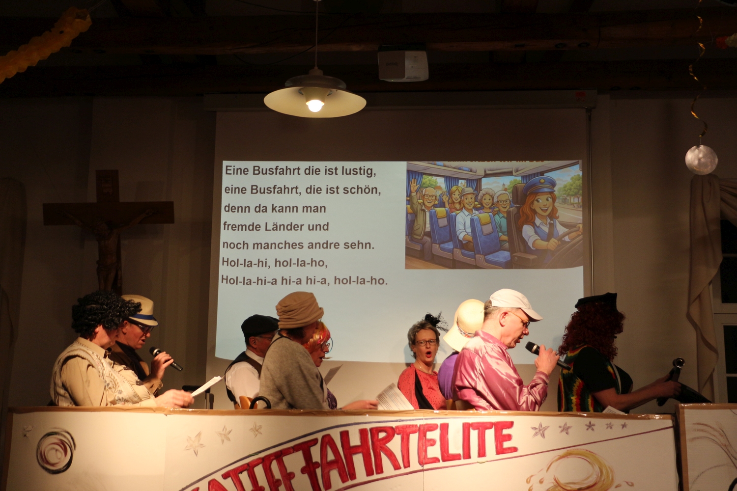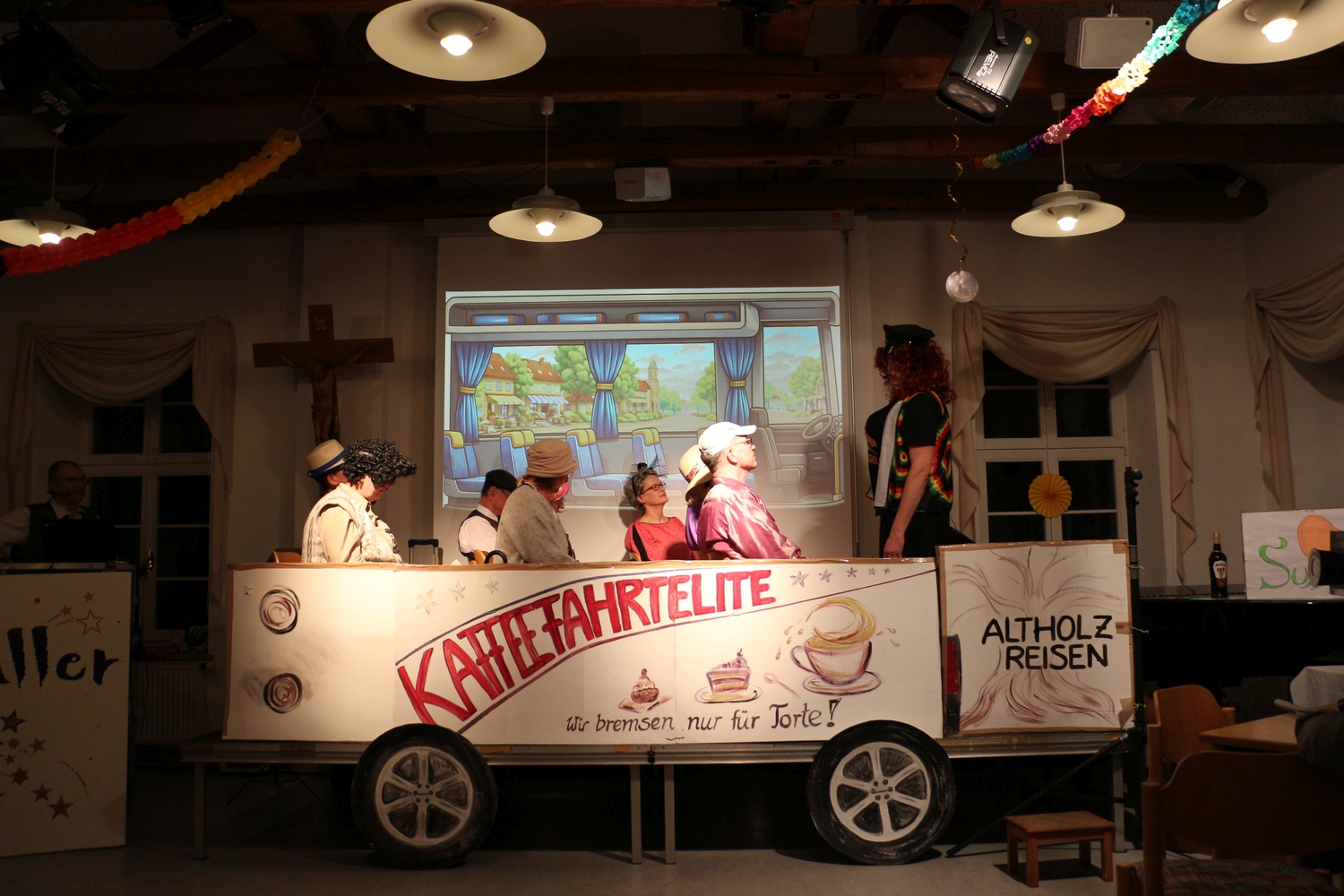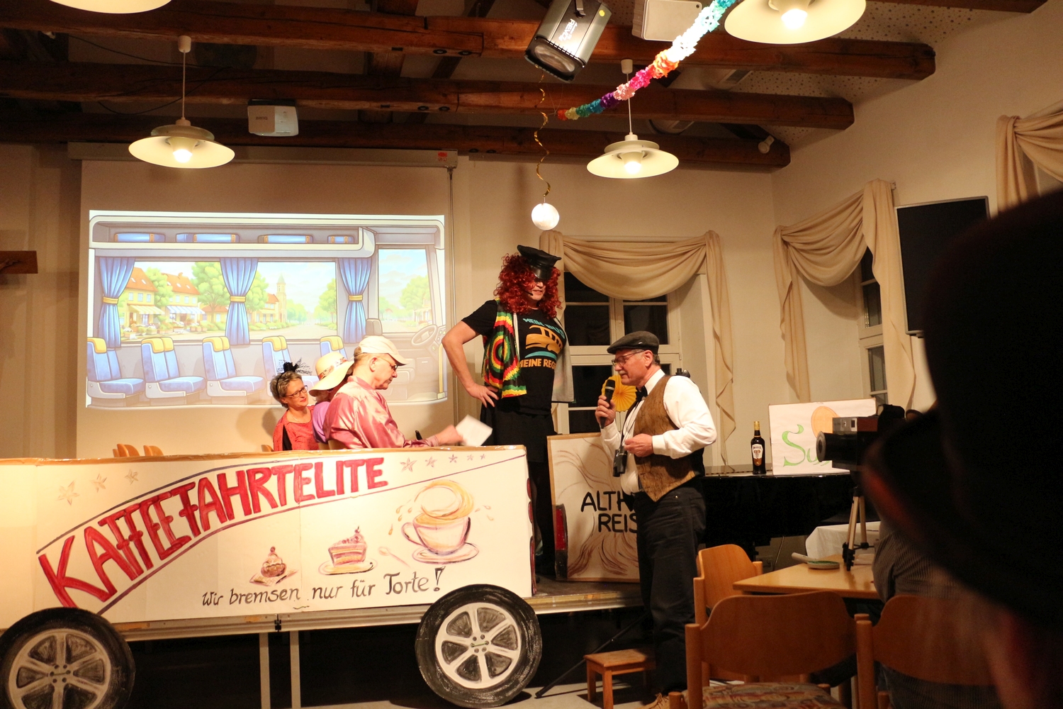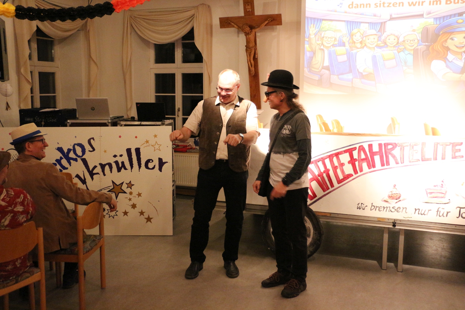 Pfarrer Cech verteilte Fahrkarten für die Kaffeefahrt. Diese entschieden erst, wer Vorrang am Büffet hatte. Dann wurde die Kaffeefahrt mit viel Klamauk großartig gespielt. Nach frohem Beisammensein mit Tanz endete der schöne Abend.