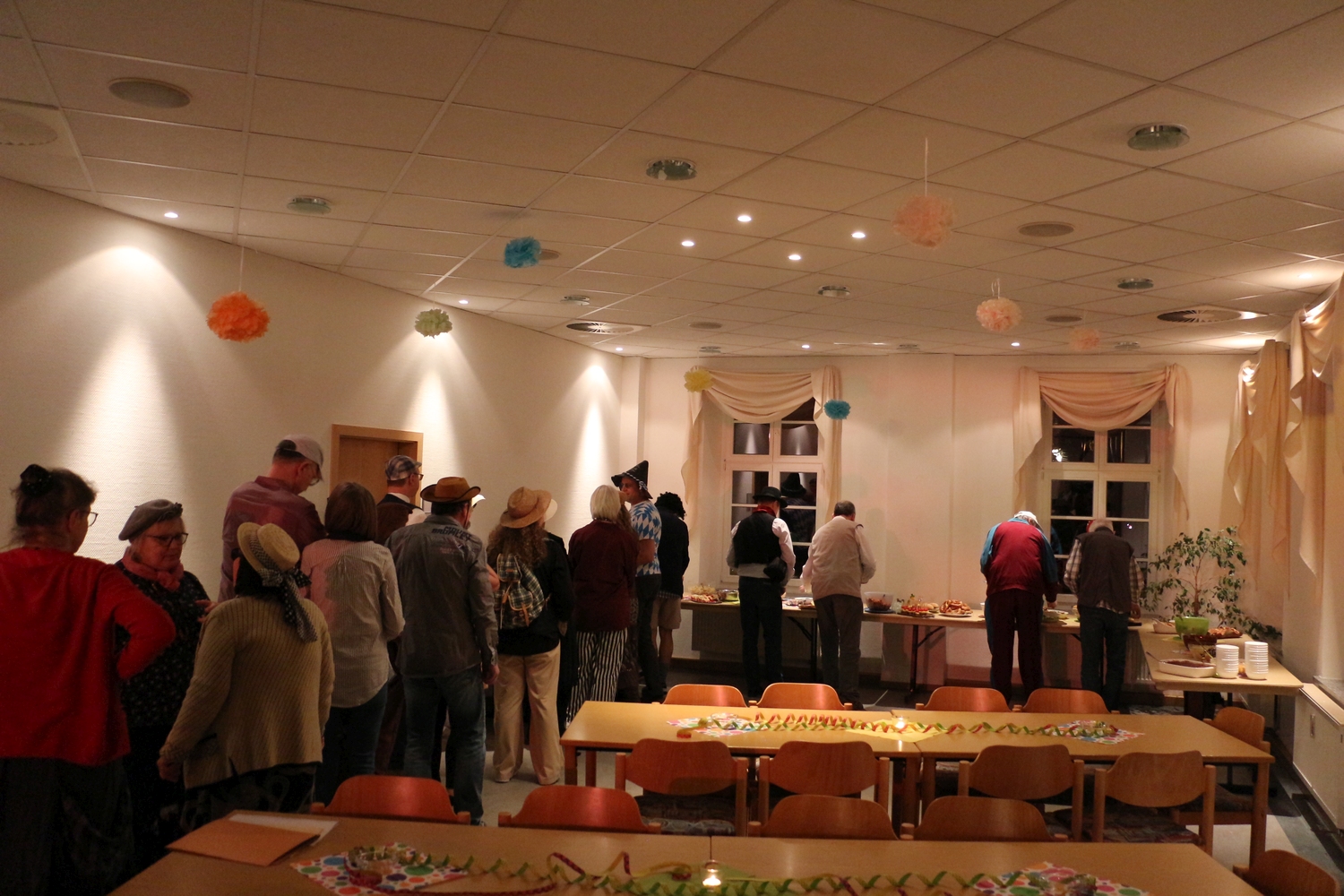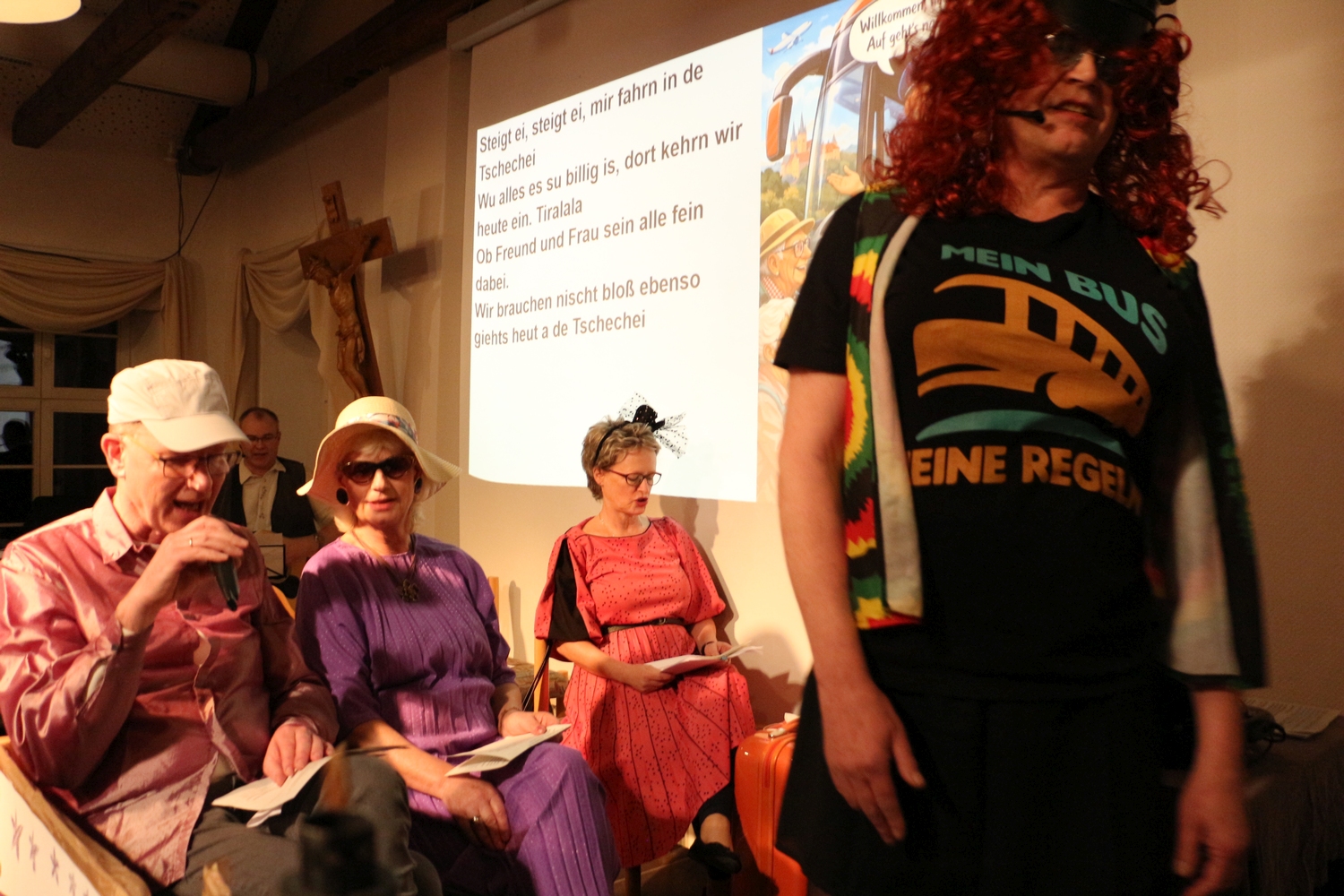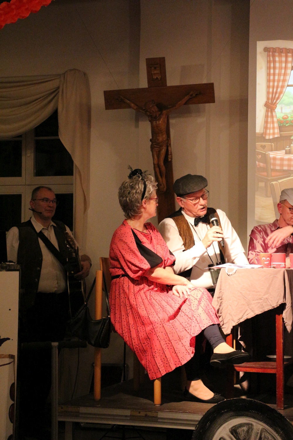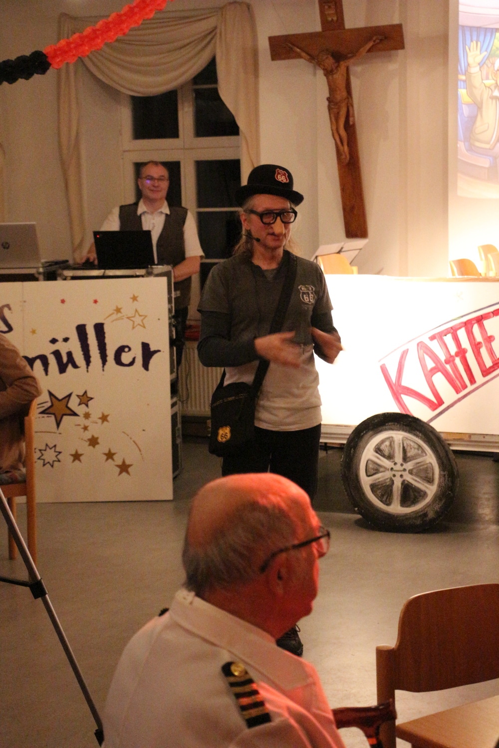 Pfarrer Cech verteilte Fahrkarten für die Kaffeefahrt. Diese entschieden erst, wer Vorrang am Büffet hatte. Dann wurde die Kaffeefahrt mit viel Klamauk großartig gespielt. Nach frohem Beisammensein mit Tanz endete der schöne Abend.